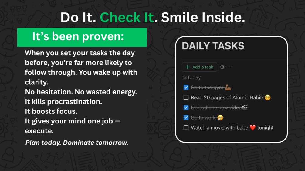 Because research shows you’re far more likely to follow through when you write your tasks down — especially the night before. It sharpens your focus, clears mental clutter, and helps you wake up with direction.
