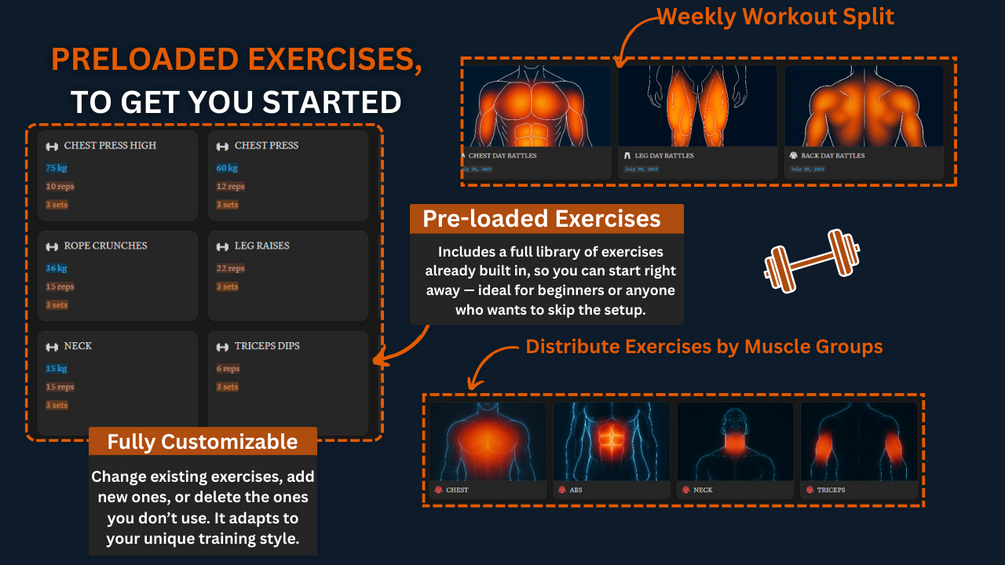 • Preloaded, tested workouts to get you started— fully customizable, so you can add, remove, or tweak anything to fit your style; A simple weight tracker to monitor your bodyweight progress; A log for progress pictures to stay motivated visually; A full exercise tracker where you input your weights lifted, reps, and sets
