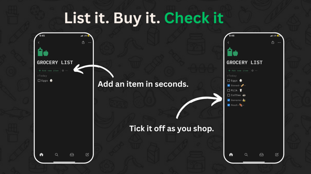Add items the moment you remember them. On your phone. From your screen. Check them off while you shop. It’s faster, more reliable than paper, and always with you.